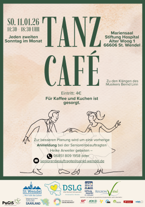 Den Auftakt macht das Tanzcafé am Sonntag, 11. Januar 2026, von 14:30 bis 18:30 Uhr im Mariensaal, der freundlicherweise von der Stiftung Hospital St. Wendel gGmbH zur Verfügung gestellt wird. Zu den mitreißenden Klängen des Musikers Bernd Linn darf nach Herzenslust getanzt werden. Für Kaffee, Kuchen und weitere Getränke ist selbstverständlich gesorgt. Der Eintritt beträgt vier Euro pro Person. Das Tanzcafé findet ab dann regelmäßig an jedem zweiten Sonntag im Monat statt.
