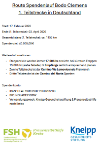 Ab dem 17. Februar 2026 läuft Bodo Clemens – 82 Jahre alt – über 3.000 km zu Fuß auf dem Jakobsweg, quer durch Europa. Sein Ziel: Spenden für die Kneipp-Stiftung des Kneipp-Bund e.V. und die Frauenselbsthilfe nach Krebs (FSH).